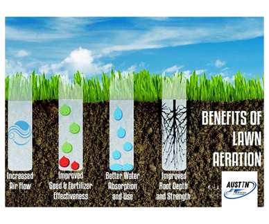 Lawn aeration is a process that involves perforating the soil of your lawn with small holes to allow air, water, and nutrients to penetrate deep into the root zone. This helps alleviate soil compaction, which can hinder root growth and limit the effectiveness of watering and fertilizing. Using a core aerator, Austin Services will create evenly spaced holes across the lawn to allow better airflow, water infiltration, and nutrient access to the roots.